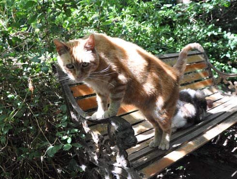 So this is how they live - we are often asked: "don't they all fight each other?" The answer is: No, in all the time we have been doing this, we have never had a serious fight, despite the fact that at times, up to 20 cats are living together. Apart from a few minor squabbles when a new one is finding his place in the pecking order, they all get on famously! There are sometimes one or two individual personality clashes, but because there is plenty of room and choice, those individuals learn to stay away from each other, so no serious problems in all these years!